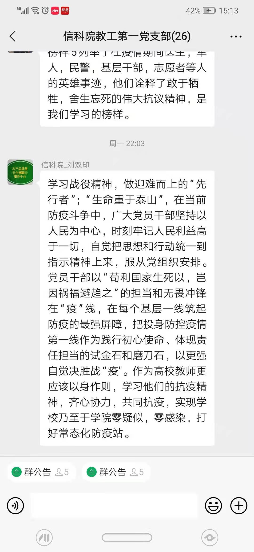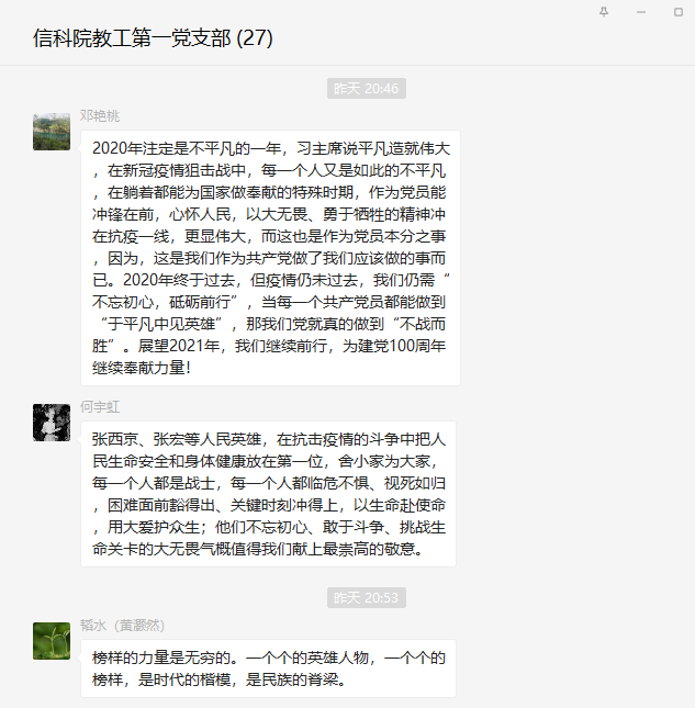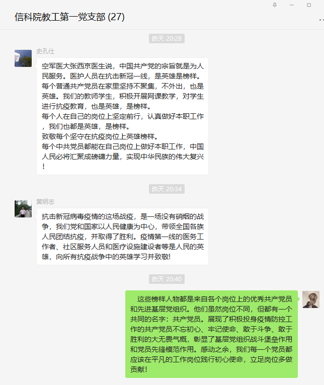 通过聆听榜样故事,支部党员无不为榜样故事所动容。在收看节目的过程中,大家都踊跃在支部微信群发言交流自己的感受。老师们一致认为,这部催泪大片是激励广大党员干部努力实现“理论学习有收获、思想政治受洗礼、干事创业有担当、为民服务解难题”目标的生动教材。纷纷表示要向榜样看齐,从榜样事迹中汲取前行的力量,并将其内化于心、外化于行。在今后的工作中,作为高校教师,应该时刻不忘师者匠心,执着坚守教书育人的初心,为学院及学校的建设贡献力量,为国家的教育事业贡献力量。