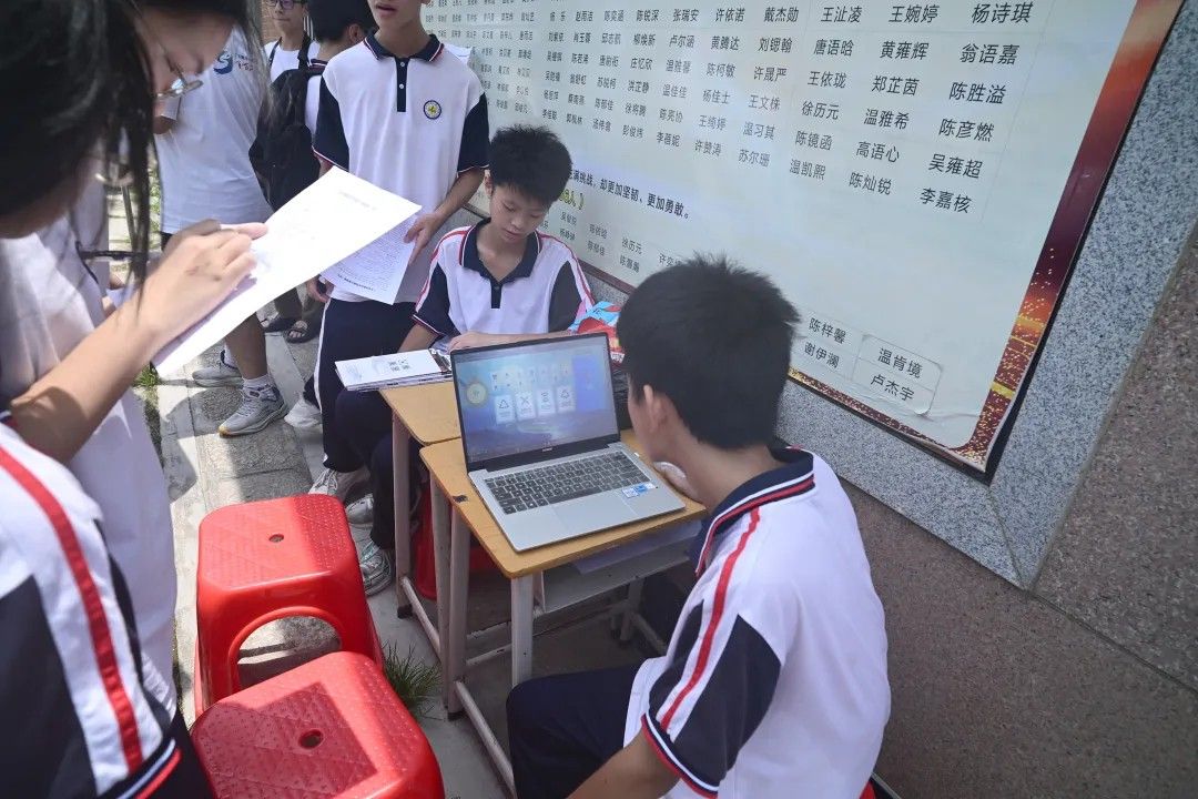 摆摊宣传:让绿色理念在校园里生根发芽。揣着调研时记录的生态故事,和净滩行动中攒下的真切感悟,团队在当地中学设置宣传点开展科普活动。通过发放彩色插图宣传手册,普及“绿美广东”建设目标与海洋生态保护知识;在互动游戏区设置“垃圾分类小游戏”,帮助同学们掌握“可回收垃圾”“有害垃圾”“厨余垃圾”“其他垃圾”的分类标准,提升青少年生态环保意识。