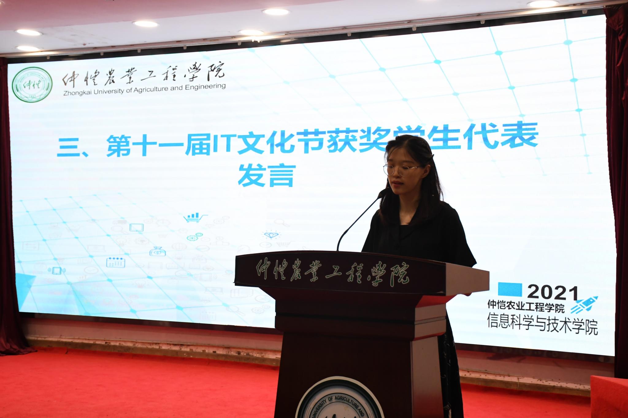 开幕式上,第十一届IT文化节获奖学生代表黄煜华同学发言。她向现场学生分享了自己的参赛经验和感受,希望在座同学把握参赛机会,明确目标,通过比赛发现不足,持续积累夯实专业基础知识,不断开拓视野激发专业兴趣,培养团队协作精神,将自己的专业知识与社会的需求、国家的发展进程紧密地联系起来,勤于钻研,在奋斗中实现自身价值。